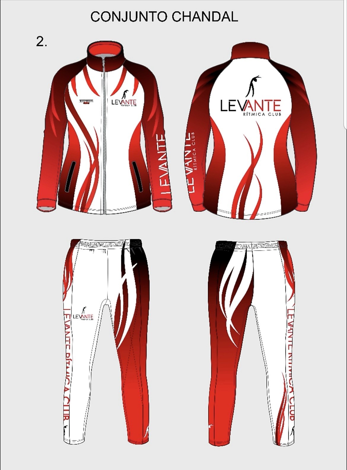 Chándal blanco y rojo, con logotipo de Club Rítmica Levante. Usado para competición.